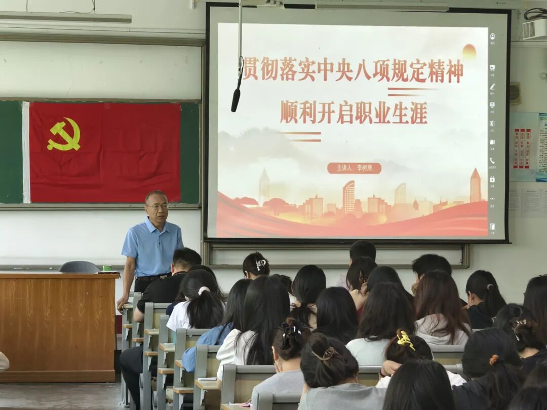 李树房以中央八项规定的具体内容为切入点,结合《贯彻落实中央八项规定精神案例详解与问题答疑》一书主要内容,通过列举实际案例深刻剖析阐释了贯彻落实中央八项规定精神的重要内涵与重大意义。李树房指出,坚定不移贯彻落实中央八项规定精神是新时代推进全面从严治党、巩固党的执政基础、引领中国式现代化建设的战略性举措,不仅事关党的作风、党群关系和党的生死存亡,同时也与党员个人发展密切相关,他呼吁与会毕业生党员在未来学业生涯和职业生涯中,一要深刻认识贯彻落实中央八项规定精神的重要意义,切实增强思想自觉和行动自觉;二要始终保持贯彻落实中央八项规定精神的高度政治自觉,不断提升个人的政治敏感性;三要学会鉴别违反中央八项规定精神的不良行为,以此为戒、严守纪律底线。