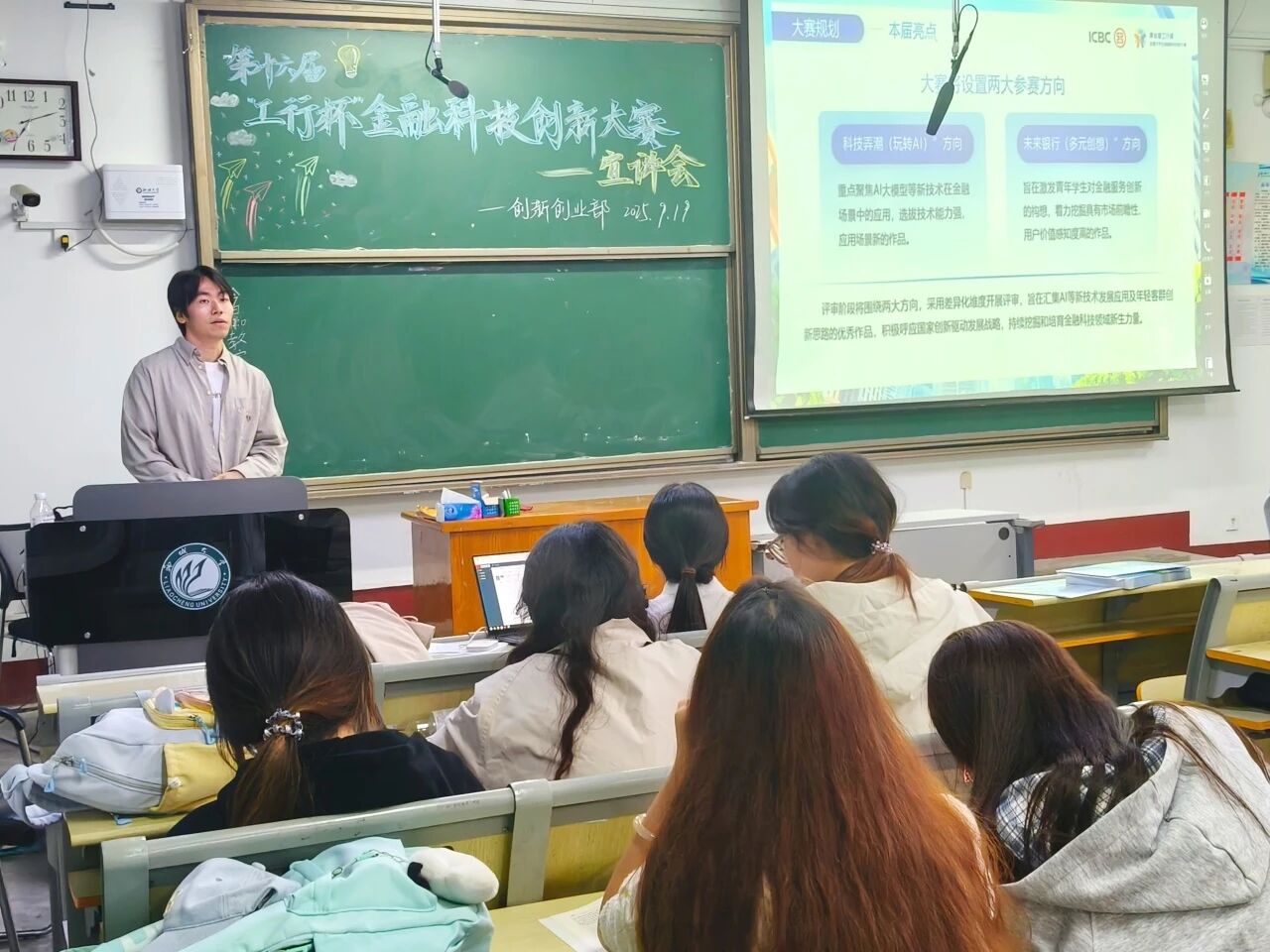 会上,孙泽龙结合PPT演示,围绕“智启新程,Young动未来”的赛事主题,系统阐述了该赛事在“教育+科技+金融”创新生态构建上的意义,并剖析了“科技弄潮(玩转AI)”“未来银行(多元创想)”两大参赛方向的技术要求和创意落点,以及报名流程、赛程节点及工行实习机会、丰厚奖金等奖项设置,助力学生对赛事相关流程内容有了更加宏观清晰的认识。