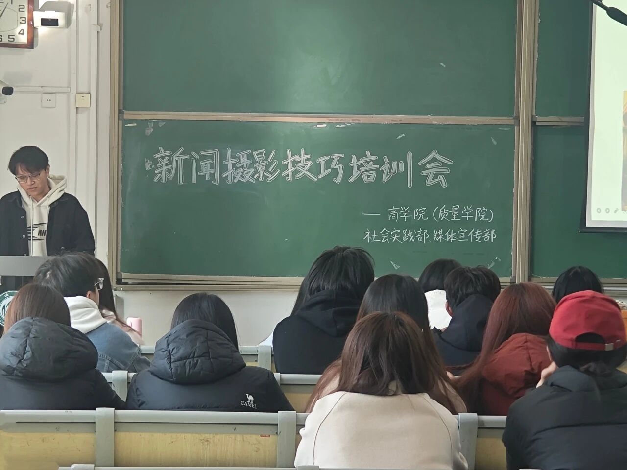 会上,孙浩恩围绕“拍摄方法与技巧”展开讲解,强调摄影需紧扣主题核心,灵活运用远景、近景与特写三种视角。针对社会实践照片的常见误区,孙浩恩特别提醒需避免摆拍痕迹,优秀的社会实践影像应捕捉自然发生的瞬间。通过真实互动与细腻表情,让照片“讲好实践故事”,传递温暖与力量。在案例分析环节,孙浩恩通过正反示例直观解析拍摄要点,并鼓励大家勤加练习,熟练掌握摄影技巧,用镜头语言生动展现大学生社会实践的蓬勃活力与独特魅力
