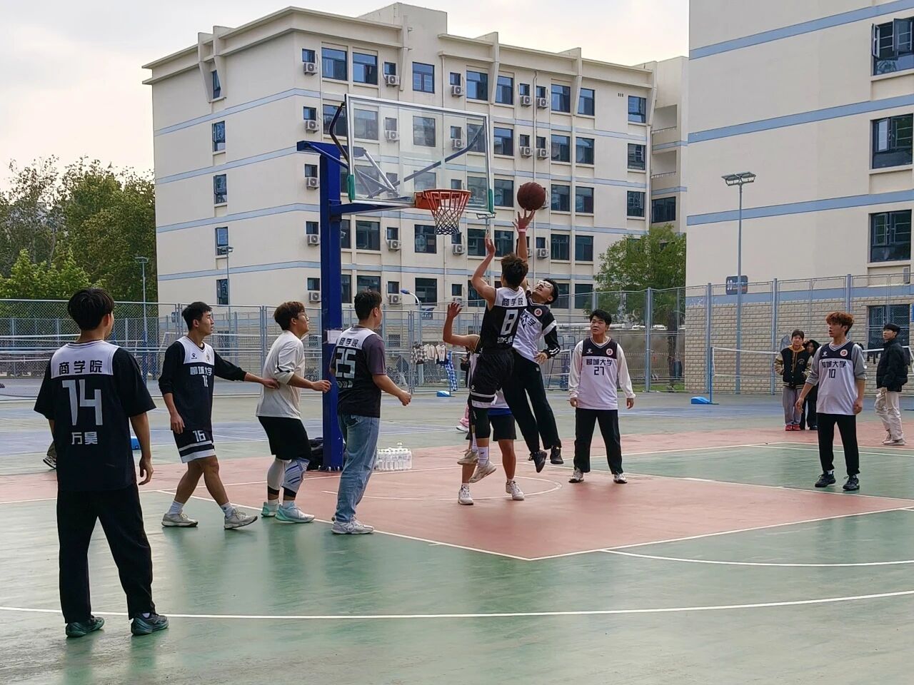 比赛开始前,篮球场上已弥漫着紧张而兴奋的氛围。两队队员早早开始热身准备,互相击掌鼓励,传递着团队的力量与信心。随后双方球员握手致意,展现了彼此间的尊重与友好。随着清脆的哨声响起,比赛正式拉开帷幕。赛场上,双方球员迅速进入状态,展开了激烈的争夺。新生队活力满满,进攻时勇往直前,多次突破老生队的防线得分;老生队则经验丰富,防守稳健,进攻配合默契。现场比分交替上升,每一次进球都伴随着观众们的欢呼与呐喊,将比赛氛围推向了一个又一个高潮。随着比赛的推进,双方球员都更加投入,老生队在关键时刻调整战术,加强防守的同时,利用精准的传球和快速的反击逐渐拉开了比分。最终,老生队凭借出色的发挥和多次参赛的经验积累取得了胜利。