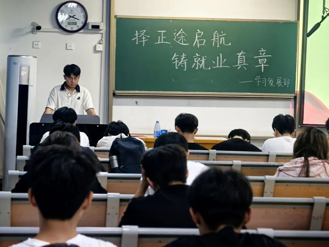 孔鑫瞳结合多媒体课件,围绕当前就业市场的热点与难点,系统梳理了就业相关知识,并通过对实际就业案例的深刻剖析,深化了在场同学对当前就业环境的认识,引发了大家对自身定位和未来选择的深入思考。随后,周沁彤与王涵先后上台分享见解。周沁彤结合自身学习与职业规划,提出高校学子就业需做到“破误区、省自身、拥多元,融国之大者, 理性奔赴未来”;王涵从树立正确就业观出发,强调要“认清现实、纠偏认知, 向下扎根、向外探索、向内生长”,拥抱职业发展的多样性。