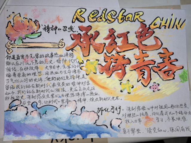 同学们紧扣“富国强国”核心主题,以情怀为笔、感悟为墨,用斑斓色彩勾勒情感温度,从多元视角挥洒创作灵感:手抄报上,天安门檐角高挑着国旗的炽红,商院学子以笔为针,把“富国”初心细细绣进笔墨肌理;画作里,红旗漫卷过中华人民共和国成立初期的熹微晨光,也映照着新时代的璀璨星河。笔墨间既承伟人之志,又绘强国盛景,一颗红心照亮奋进征程。这方寸天地间的一抹红,是青春与家国相撞的滚烫回响,更是青年一代捧给时代的赤诚答卷。