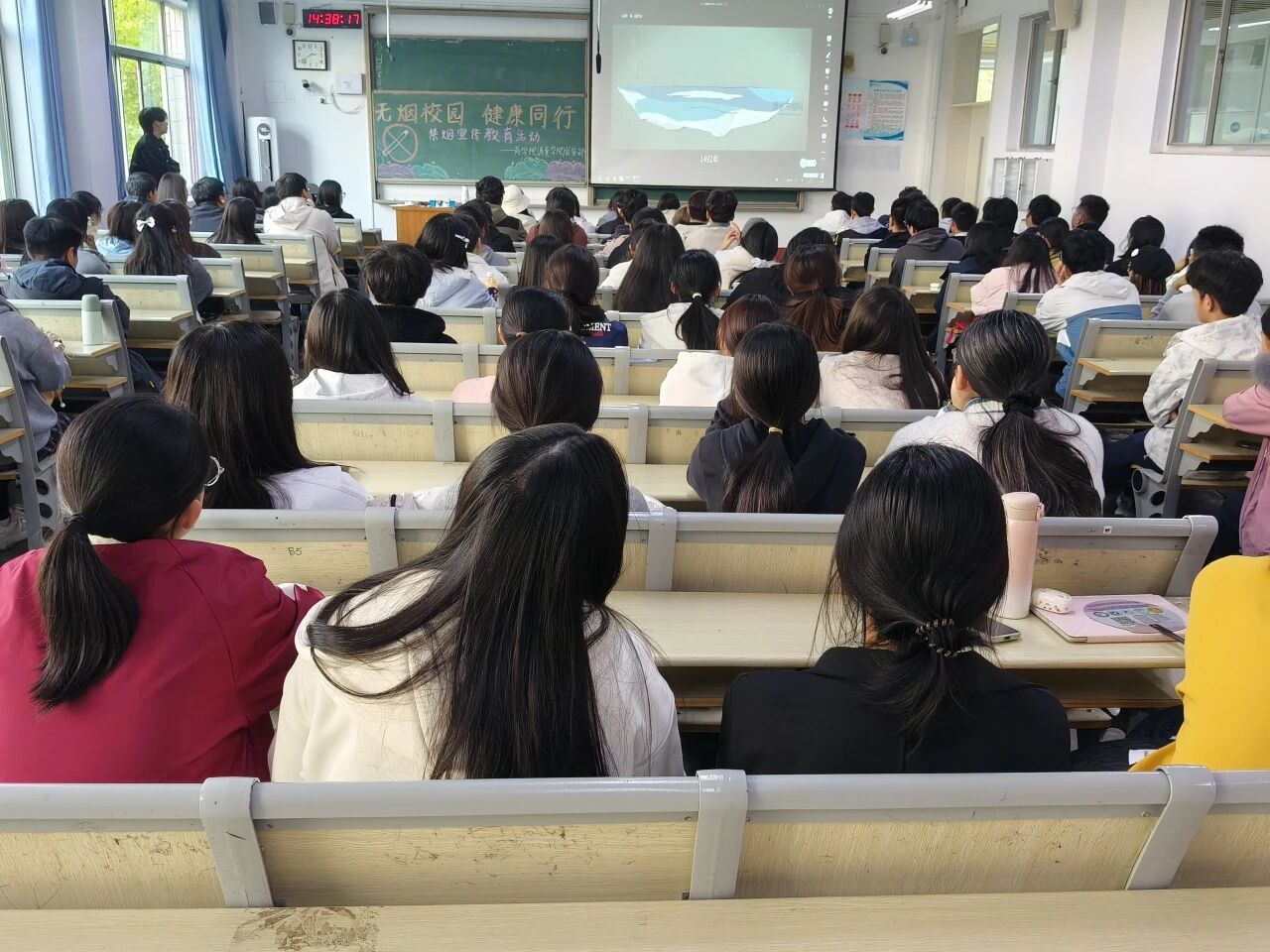 李洪涛从烟草发展的脉络切入,在追溯烟草起源与传播历程,加深与会学生对烟草宏观认知的同时,凭借生动的讲述方式,结合典型案例与权威数据,清晰呈现了烟草对吸烟者自身呼吸系统、心血管系统等多方面的损害,以及二手烟对身边人群健康造成的威胁,让同学们深刻认识到烟草的“隐形杀伤力”。在此基础上,李洪涛围绕戒烟案例,详细介绍了戒烟的益处,以及大学生戒烟的可行方法,呼吁全体同学从自身做起,拒绝烟草诱惑,携手共创无烟校园环境,有效提升了同学们对吸烟危害认知的同时,进一步增强学院学子的禁烟意识,为促进学生身心健康发展奠定了良好基础。