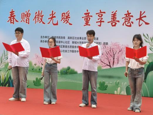 我院团委书记刘玉华向高新区社会事业部副部长蔡志儒移交爱心物资;聊城高新区聚爱志愿服务中心理事长苏金生向高新区九州街道党建办主任李莹莹捐赠书籍,以书香浸润童心,助力流动儿童成长发展。