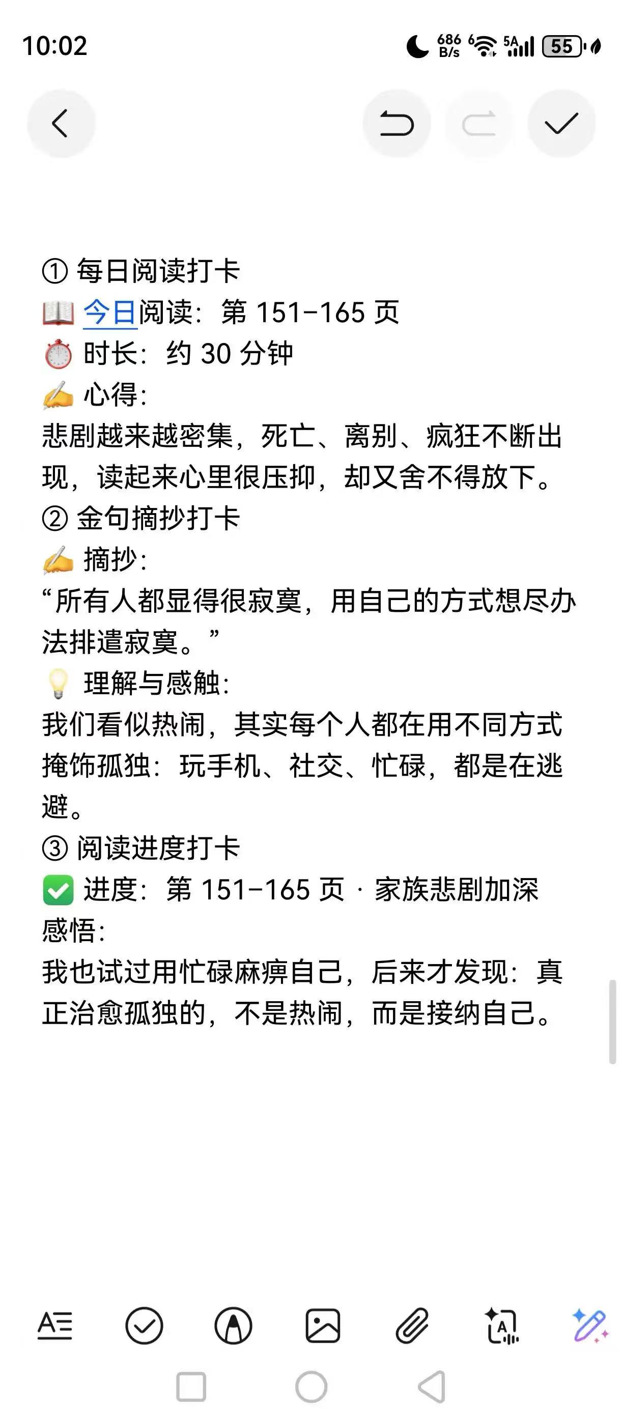 活动依托线上平台开展,每日通过打卡小程序记录阅读轨迹。本次打卡设置三项内容,陪伴大家沉浸式阅读:每日坚持固定阅读时长或页数,搭配心得感悟,在文字中沉淀思绪、养成习惯;摘录书中金句并写下理解与感触,让文字力量直抵内心;同步记录阅读页码与章节,结合自身经历分享思考,让阅读不止于翻页,更与生活紧密相连。